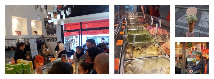Pour le dessert nous avons découvert une « gelateria » dans le quartier de Navigli hors du commun. Pour commencer, deux choses la distinguent : la file d’attente et le portier. Oui ce petit glacier dispose d’un portier comme dans les discothèques. Et l’organisation est coordinée comme un orchestre : on paye le nombre de boules-cones ou barquette, on reçoit un ticket et on choisit ensuite son parfum. Choisir est difficile, je choisis : pistacchio di bronte (leggermente salato e tostato). C’est la première en Italie où j’ai vu les deux options de parfum pistaches: tostées ou non. Ils possèdent deux boutiques à Milan, donc n’hésitez pas à vous y arreter.